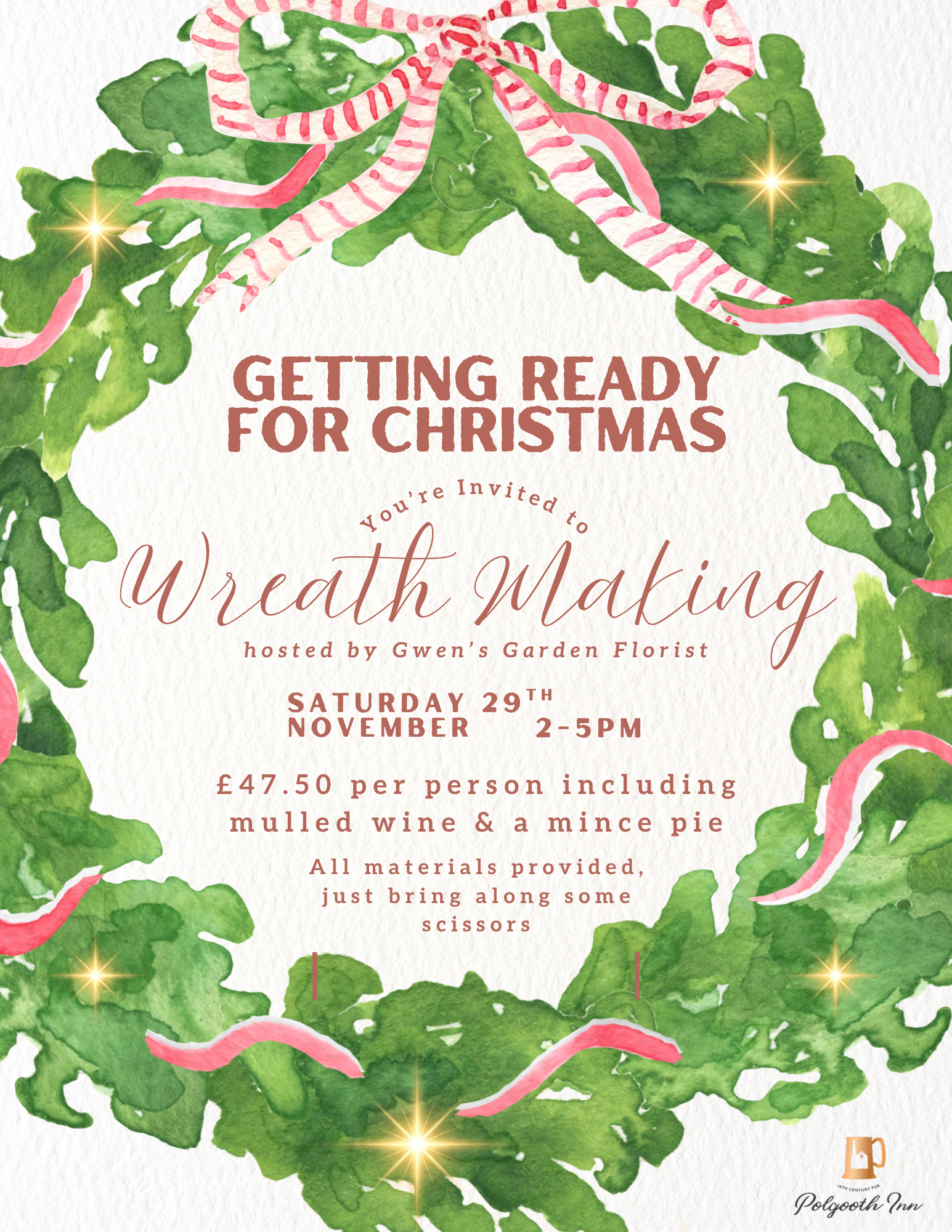 Wreath Making with Gwen's Garden Florist Saturday, November 29, 2025 2:00 PM 5:00 PM 14:00 17:00 Polgooth Inn Ricketts Lane St Austell PL26 7DA (map) Google Calendar ICS Get ready for Christmas the right way.. by making your own wreath! Tickets available now
